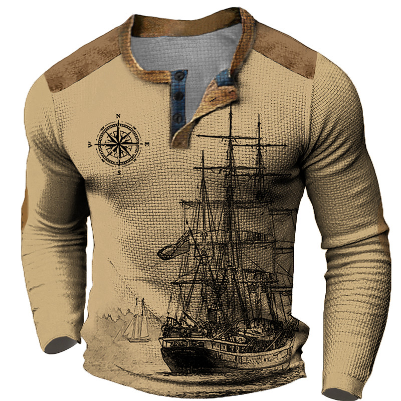 Men's Ship Nautical Compass Henley Shirt Waffle T Shirt Long Sleeve 3D Print Designer Retro Vintage Casual Sports Outdoor Holiday Festival Spring Fall Light Brown Blue Brown Green Gray Henley