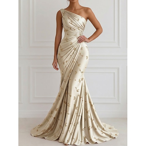 Sirena Tromba Strascico a Terra Abito da Sera Elegante Floreale Setoso Senza Maniche Monospalla Festa serale Festa in giardino Raso Jacquard con Arricciato