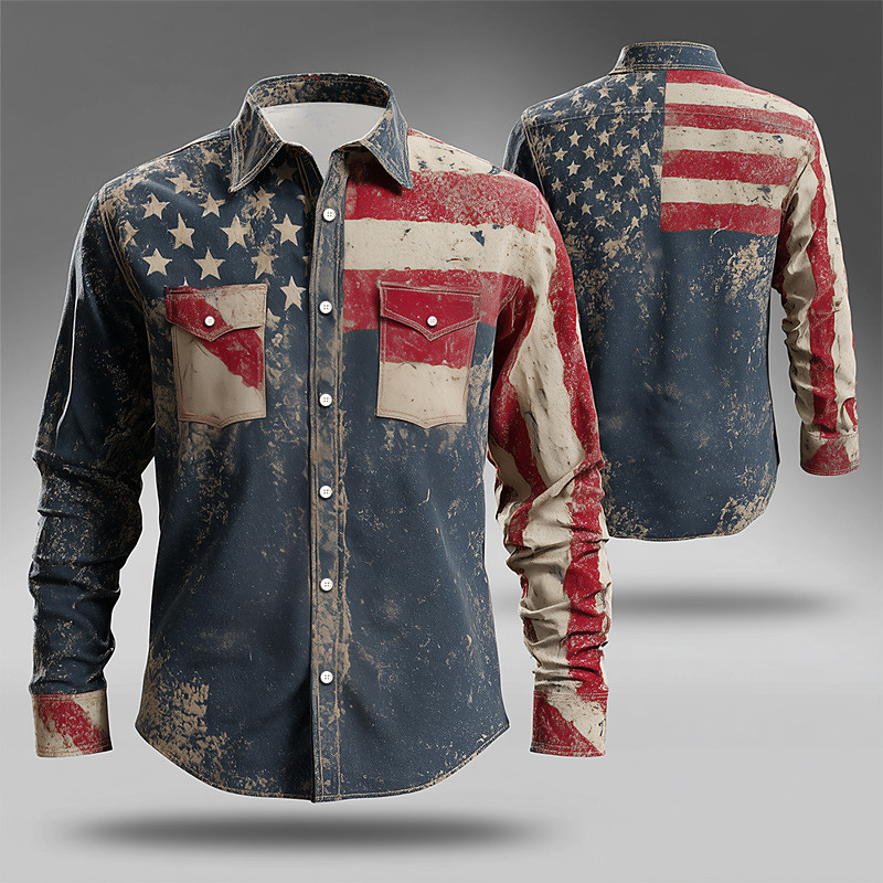 Men's American US Flag Patriotic Shirt Western Shirt Long Sleeve Vintage Retro Casual Holiday Spring Fall Turndown Front Two Pockets Linen Like Shirt Button Up Shirts Blue