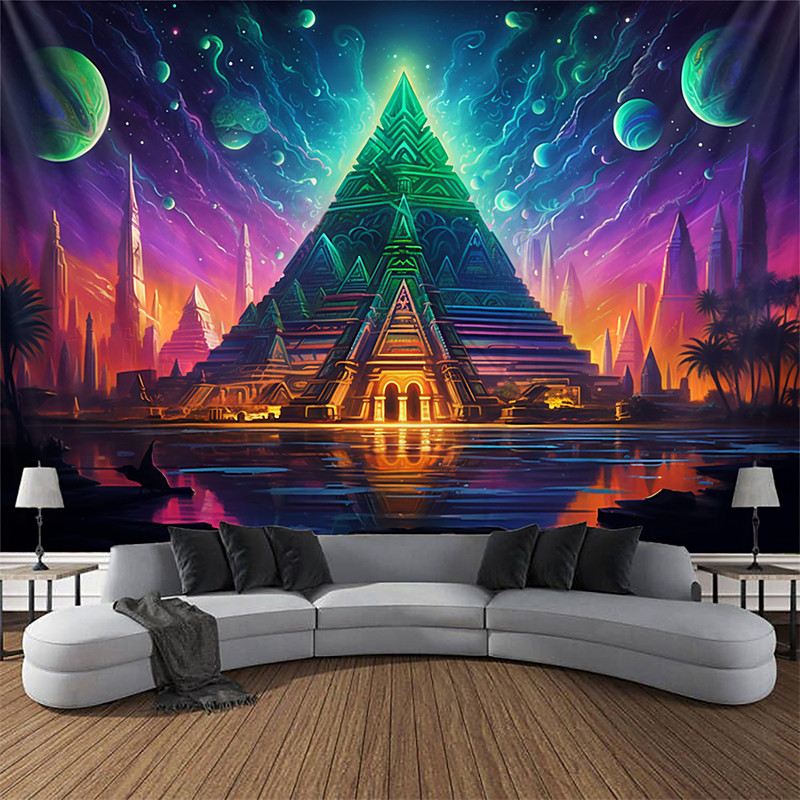 Blacklight Tapestry UV Reactive Glow in the Dark Glow Party Neon Trippy Misty Pyramid Egypt Hanging Tapestry Wall Art Mural for Living Room Bedroom