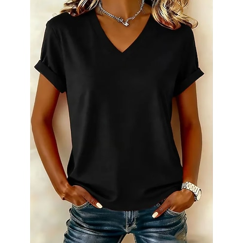 Per donna Maglietta Camicia di cotone Tinta unica Classico Manica Corta Scollo a V Top Regolari Casuale Quotidiano Uscire Nero Bianco Rosa Estate Primavera