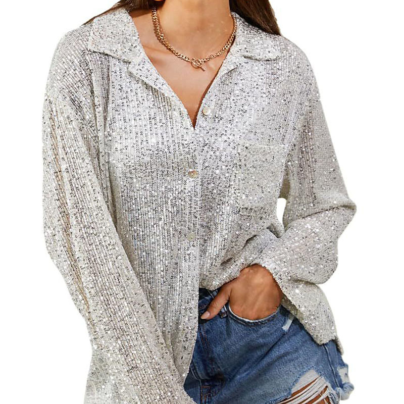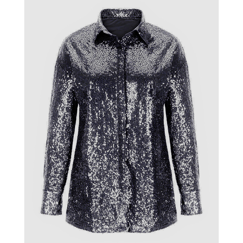 Women's Shirt Blouse Sequin Tops Plain Vintage Stylish Long Sleeve Shirt Collar Regular Tops Holiday Going out Sequins Silver Black Fall Winter