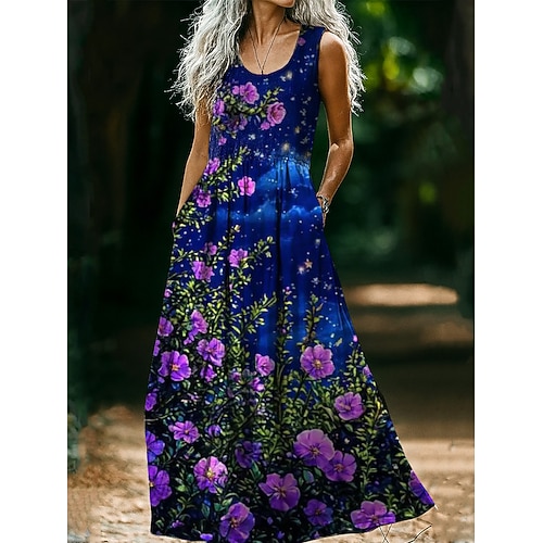 Per donna Abito maxi Abito Pieghettato Vacanza Casual Boho Feste Uscire Spiaggia Vestibilità regolare Floreale Grafico Senza Maniche Collo a U Blu Rosa Vino Marrone chiaro Estate Primavera
