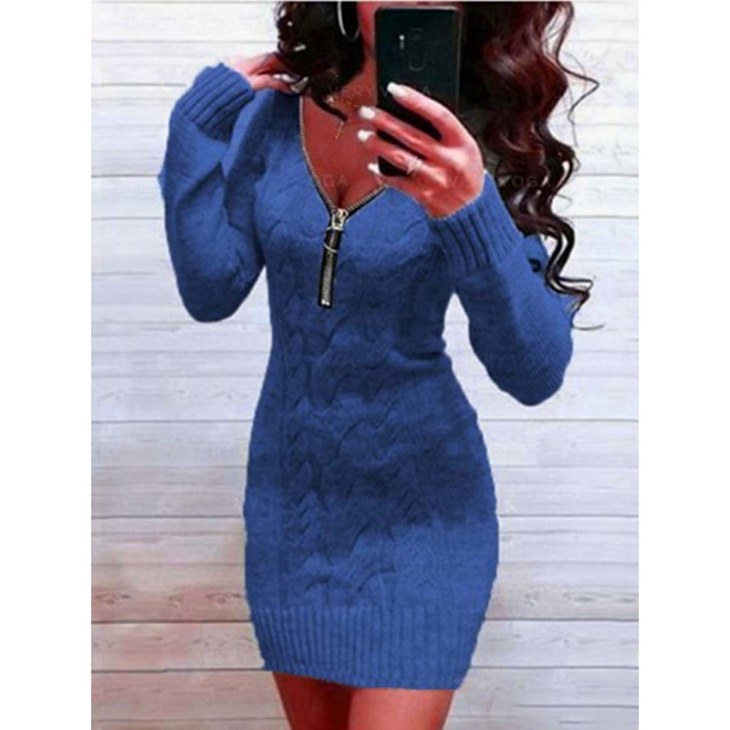 Women's Sweater Sweater Dress Casual Soft Pure Color Ribbed V Neck Zipper Knitted Long Sleeve Long Tops Knit Outdoor Party Daily Wine Army Green Fall Winter