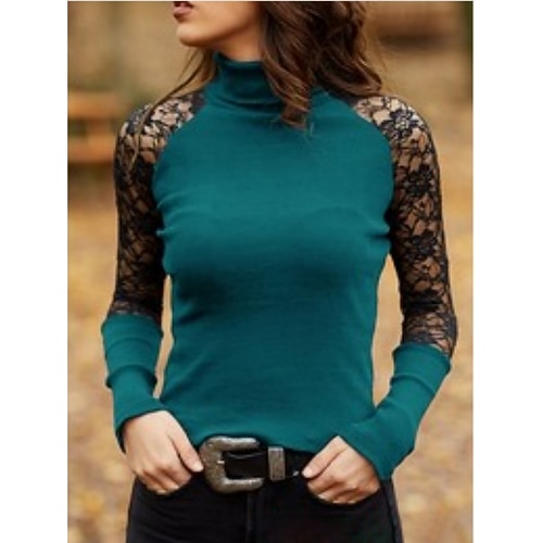 Per donna Blusa Tinta unica Elegante Casual Manica Lunga Collo Alto Top Regolari Quotidiano Pizzo Patchwork Blu Nero Vino Blu Reale Viola Primavera Autunno Inverno