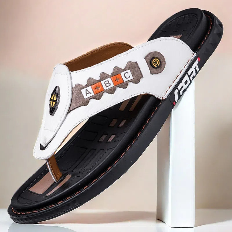 Men's Sporty Faux Leather Flip-Flops with Athletic Logo Detail - Durable Casual Summer Footwear for Active Wear