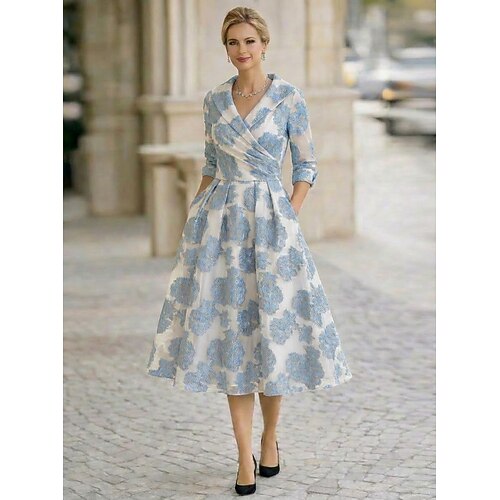 Linea ad A Lunghezza Tè Abito da Cocktail Abito da invitata a nozze Abito da cerimonia per signora Manica 3/4 Scollo a V Elegante Vintage Semplice Formale Jacquard con Pieghe