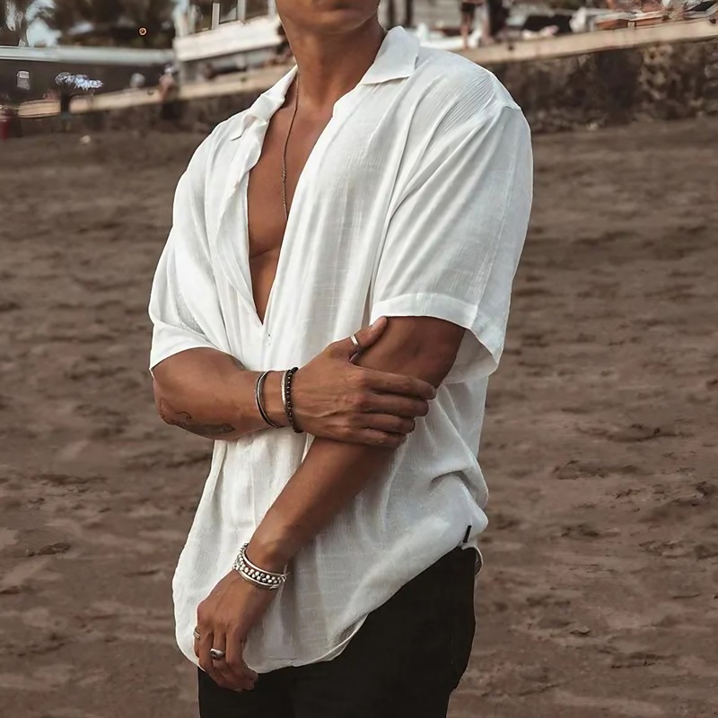 Men's Summer Shirt Beach Wear Button Up Shirt Plain Vacation Curise White Blue Khaki Gray Short Sleeve Turndown Summer Clothing Apparel