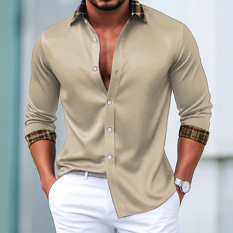 Men's Geometric Grid / Plaid Shirt Satin Shirt Dress Shirt Long Sleeve Vintage Retro Vacation Dailywear Summer Spring Fall Turndown 3D Print Button Up Shirts Dark Khaki Brown Khaki