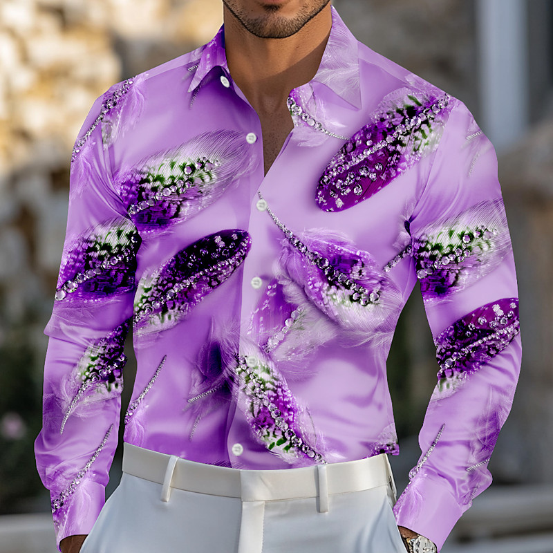 Mardi Gras Men's Feathers Dazzle color Carnival Shirt Satin Shirt Dress Shirt Long Sleeve Fashion Casual Party Holiday Summer Spring Turndown 3D Print Button Up Shirts Blue Yellow Purple
