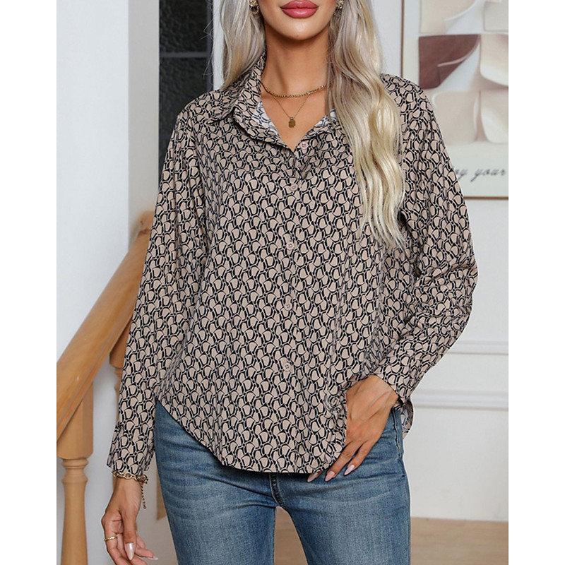 Women's Shirt Geometric Daily Stylish Basic Long Sleeve Shirt Collar Regular Tops Work Daily Holiday Buttons Black White Khaki Spring Fall