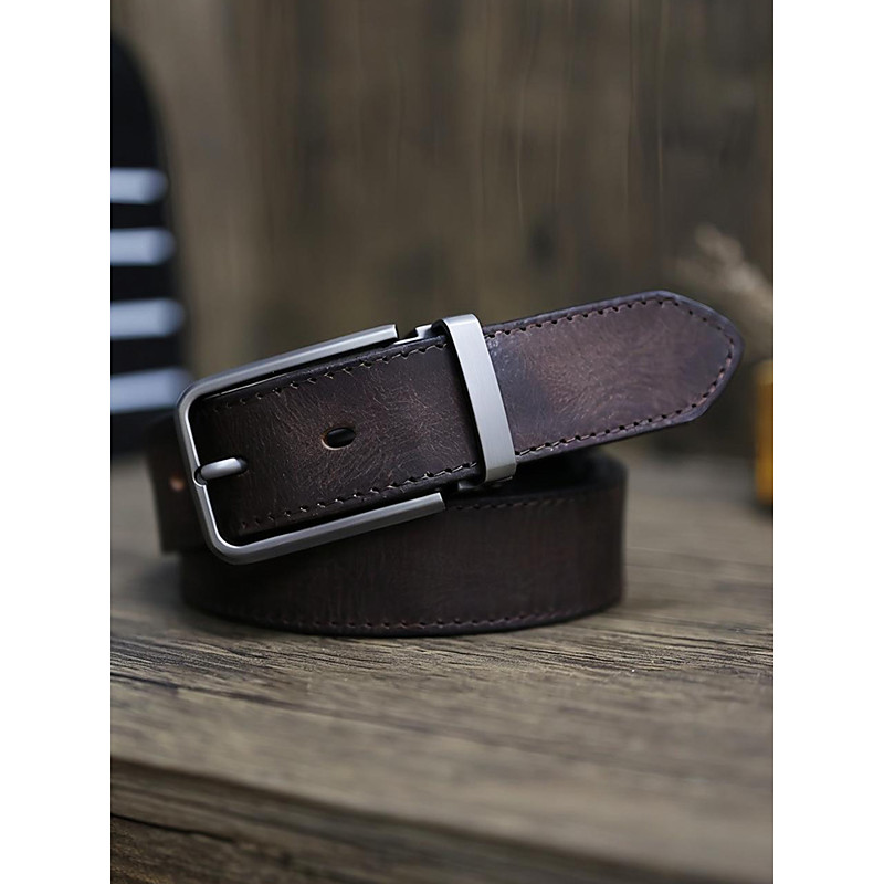 Men's Genuine Cowhide Leather Belt – Vintage Brown Strap with Matte Alloy Pin Buckle, Adjustable for Jeans, Work, Business Casual Everyday Wea