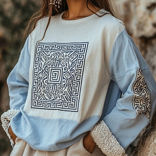Per donna Camicie di cotone e lino Camicia Boho Geometrico Semplice Quotidiano Elegante Essenziale Manica Lunga Girocollo Top Regolari Lavoro Quotidiano Ferie Stampato Bianco Blu Arancione Cachi