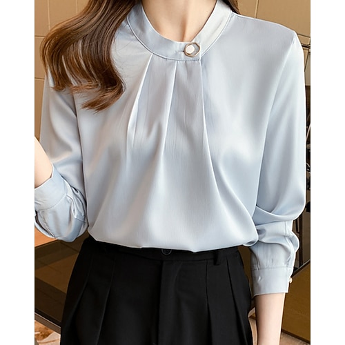 Per donna Camicia Elegant Elegante Raso/Satin Semplice Elegante Formale Manica Lunga Scollo a V Top Regolari Lavoro Uscire Arricciato Bottoni Bianco Champagne Blu Grigio Primavera Autunno