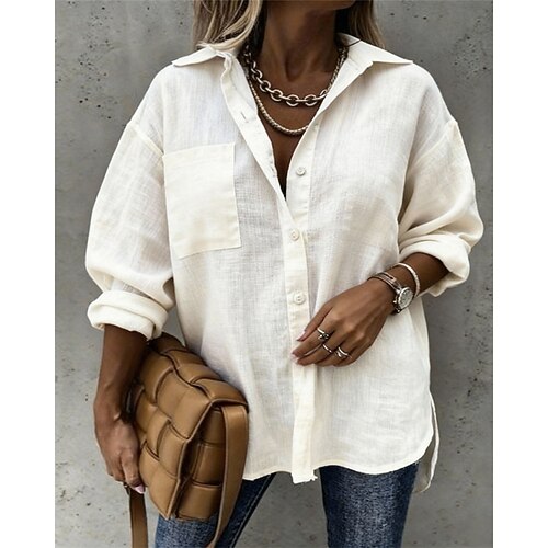 Per donna Camicia Camicia in cotone e lino Maglia Henley Semplice Quotidiano Elegante Casual Manica Lunga Scollo a V Top Regolari Lavoro Quotidiano Ferie Bottoni Bianco Blu Beige Primavera Autunno