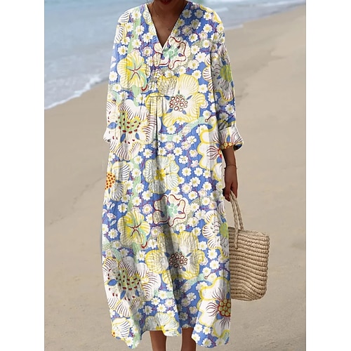Per donna Abito maxi Abito a Tubino Vacanza Casual Uscire Vestibilità comoda Floreale Grafico Manica Lunga Scollo a V Blu Giallo Arancione Blu chiaro - bianco Estate Primavera