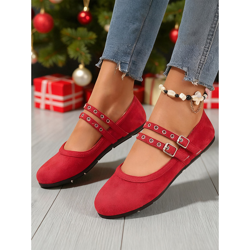 Women's Red Mary Jane Flats with Double Buckle Straps – Elegant Holiday Style for Parties, Casual Gatherings and Festive Occasions