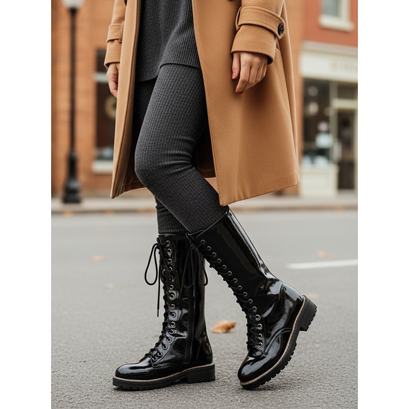 Women's White Lace Up Combat Boots, Classic Casual Preppy Faux Leather Patent Leather Mid Calf Boots for Office, Casual Wear and Outdoor Activities
