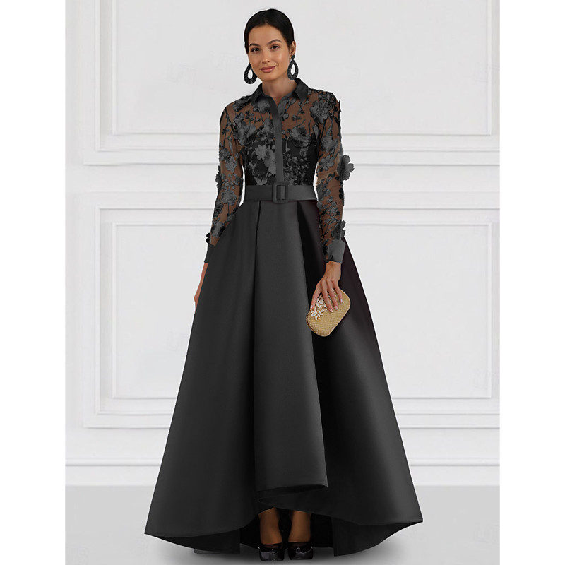 A-Line Floor Length Evening Gown Ball Gown Formal Dress Elegant Long Sleeve Shirt Collar Formal Holiday Pocket Satin Lace with Embroidery