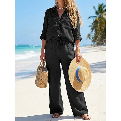 Per donna Set di Pantaloni Finto cotone e lino Manica Corta Girocollo Tinta unica Moda Streetwear Casuale Quotidiano All'aperto Blu Nero Bianco Primavera Estate Vestibilità comoda