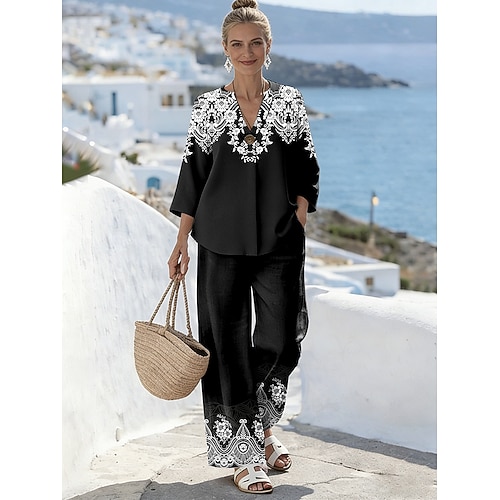Per donna Set di Pantaloni Finto cotone e lino Manica 3/4 Scollo a V Tinta unica Moda Streetwear Casuale Quotidiano All'aperto Blu Nero Rosa Estate Vestibilità comoda
