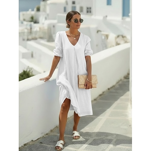 Per donna Abito Midi Finto cotone e lino Vestito Casual Abito in cotone e lino Moda Moderno All'aperto Vacanza Ferie Vestibilità comoda Semplice Mezza Manica Scollo a V Blu Bianco Rosa Azzurro Estate