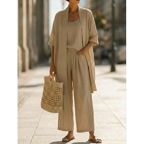 Per donna Set di Pantaloni Finto cotone e lino Manica 3/4 Girocollo Tinta unica Elegante Moda Streetwear Casuale Quotidiano All'aperto Bianco Verde militare Blu marino scuro Estate Vestibilità comoda