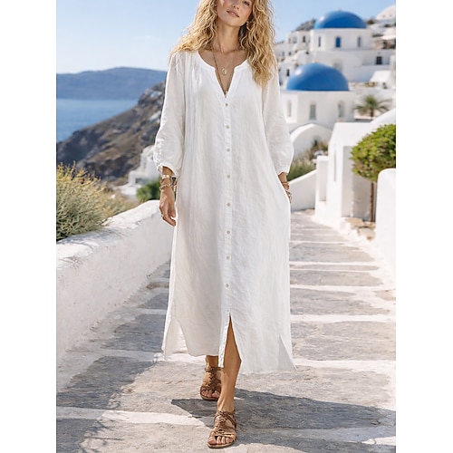 Per donna Abito maxi Finto cotone e lino Abito a Tubino Abito Camicia Abito Bianco Elegante Essenziale Casual Manica a Lanterna Quotidiano Casa Lavoro Vestibilità comoda Semplice Manica Lunga Scollo