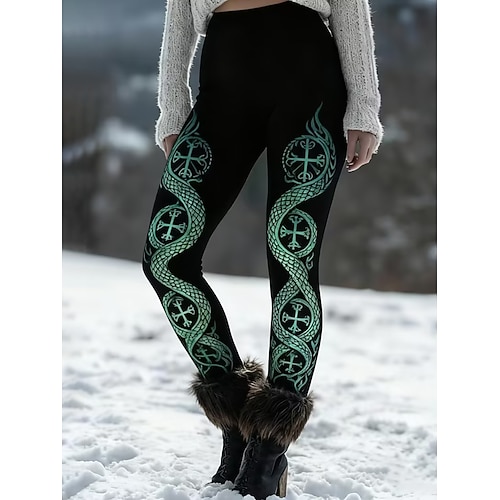 Damen-Leggings im Wikinger-Stil, kuschelig, für Urlaub, Vintage-Look, Ethno-Stil, lange Länge, hoher Bund, Grafikprint, bequem, dehnbar, lässig, für Alltag, Urlaub, grün, Sommer, Frühling, schmale