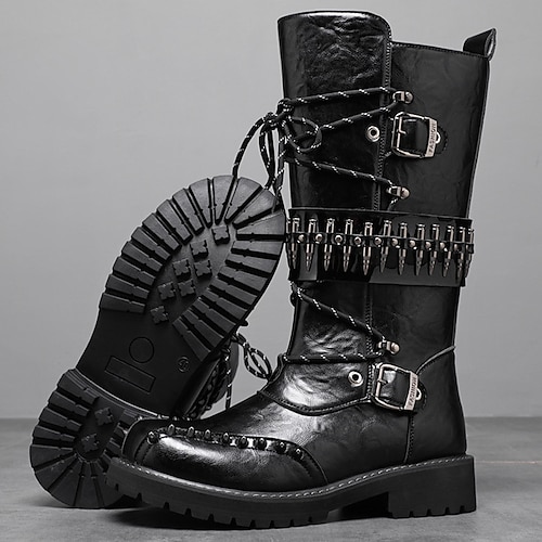 stivali da combattimento punk gotici da uomo: stivali neri con lacci a metà polpaccio, cinturini con fibbia, borchie chiodate e suola resistente per Halloween, cosplay e feste notturne