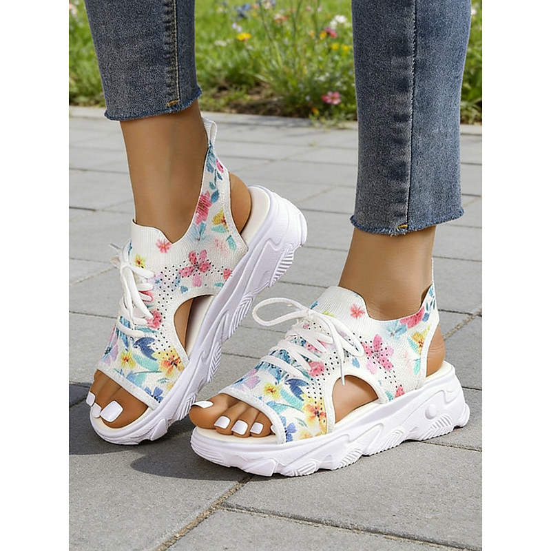 Women's Colorful Floral Print Platform Sandals - Lace-Up Open-Toe Sneaker Sandals for Summer Outings, Walking and Casual Vacation