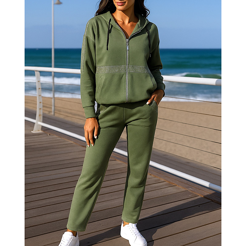 Women's Fashion Streetwear Tracksuit Pants Sets Bolero Top Long Sleeve Stand Collar Plain Zipper Casual Daily Outdoor Army Green Dark Green Brown Summer Regular Fit