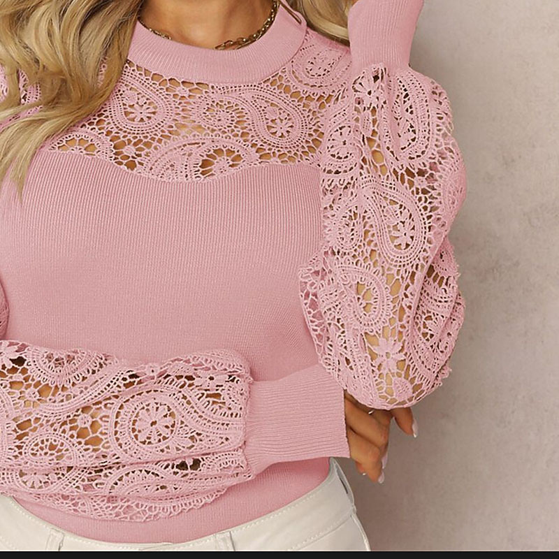 Damen Elegante Weiße Spitzen Tops Ösen Bluse Stylisch Lässig Einfarbig Ösen Langarm Rundhals Täglich Romantische Petite Tops Sommer Urlaub Tragen Grasgrün Rosa Blau Beige Sommer Frühling Herbst