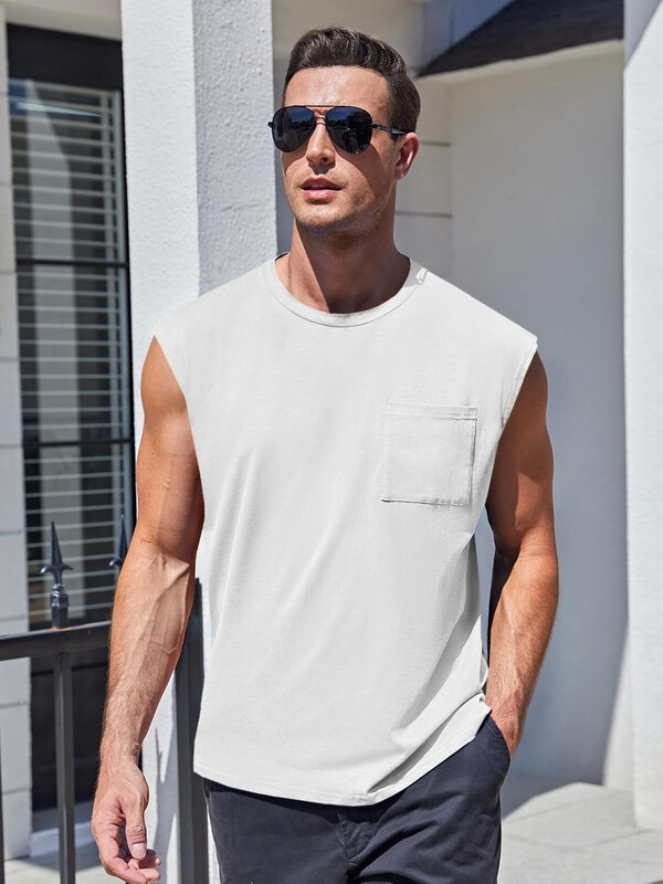 Men's Sleeveless Tank Tops Workout Cut Off Shirts MUSCLE Gym T Shirts with Pocket (White, L)