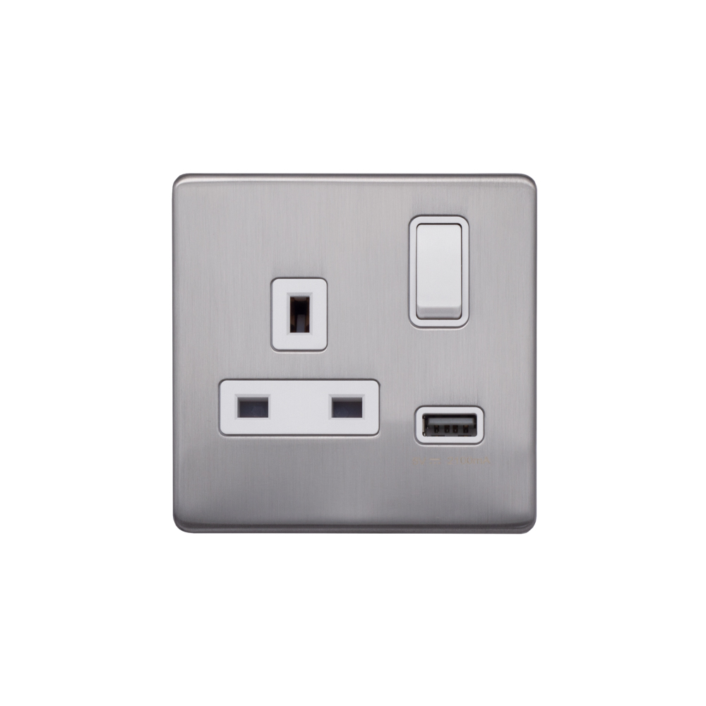 Lieber Brushed Chrome 1 Gang 13A DP Socket with USB-A 2.1A - Size: 86mm x 86mm x 3.3 mm