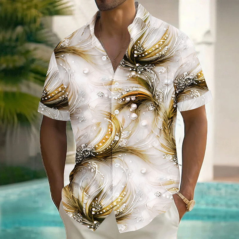 Men's Geometric Waves Pearl Shirt Summer Shirt Button Up Shirt Short Sleeve Fashion Casual Vacation Holiday Streetwear Summer Turndown 3D Print Front One Pocket Linen Like Shirt Blue Green Khaki