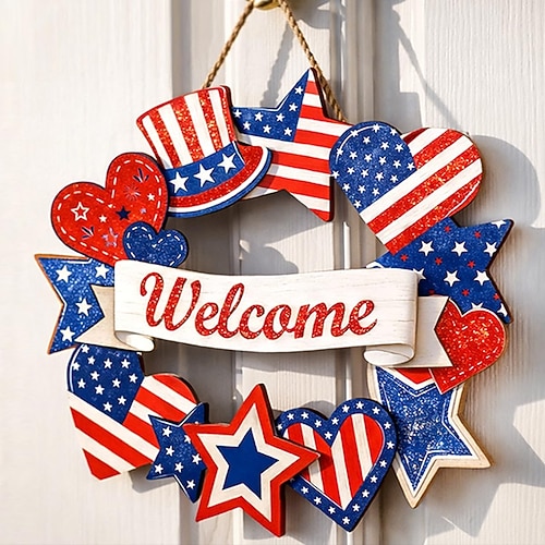 Holzdekorationen zum 4. Juli, patriotische Kränze für die Haustür, Dekorationen zum Unabhängigkeitstag, Sternenschild, Willkommensgruß, Gedenktag, Wanddekoration für Zuhause, drinnen und draußen, rot,