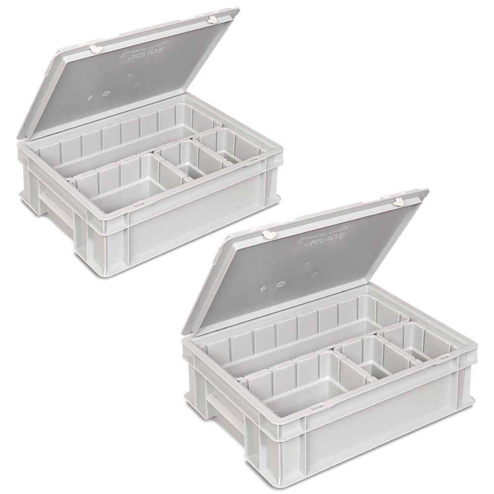 2x Euro-Deckelbehälter mit 4 Einsatzkästen, LxBxH 400x300x130 mm, grau