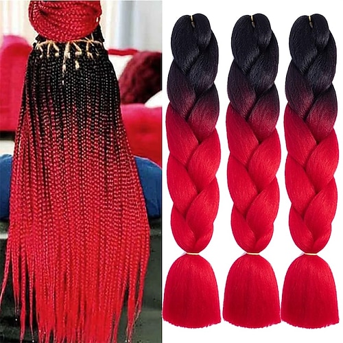 treccia per capelli ombre da nero a rosso, extension per capelli con treccia, impostazione ad acqua calda, alta temperatura, fibra sintetica, 24 pollici (confezione da 1-3) 24 pollici (confezione da
