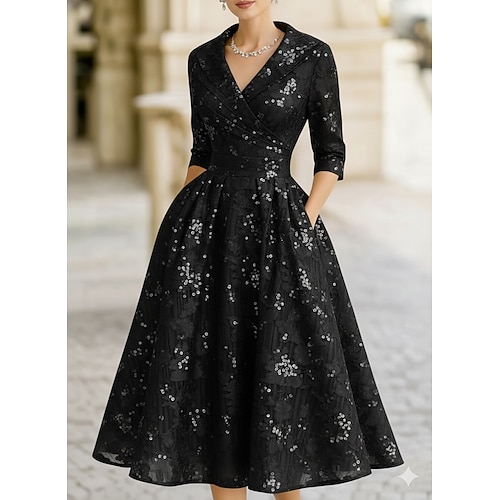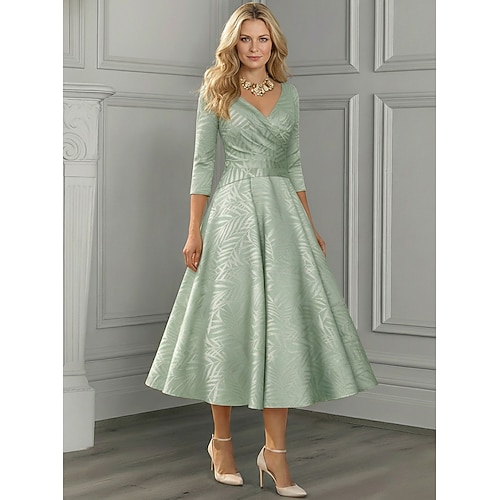 Linea ad A Lunghezza Tè Abito da Cocktail Abito da invitata a nozze Abito da cerimonia per signora Manica 3/4 Scollo a V Elegante Vintage Semplice Formale Jacquard con Pieghe