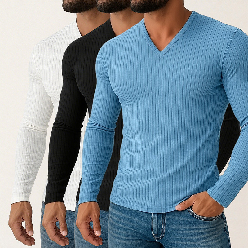 3Pcs Men's T Shirt Ribbed Knit tee Tee Top Long Sleeve Shirt Long Sleeve V Neck Spring Fall Winter Plain Pit Strip Fashion Designer Basic 3-Piece Knitting Vacation Street Tee