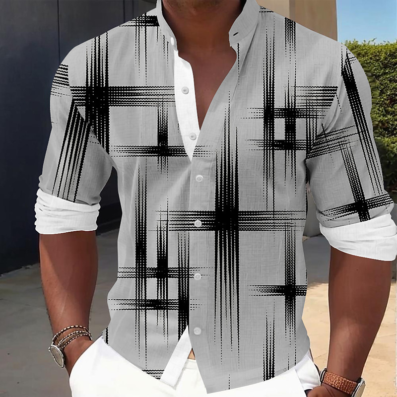Men's Geometric Lines / Waves Shirt Button Up Shirt Stand Collar Shirt Short Sleeve Fashion Casual Vacation Daily Summer Spring Mandarin Collar 3D Print Linen Like Shirt White Pink Blue Green Khaki