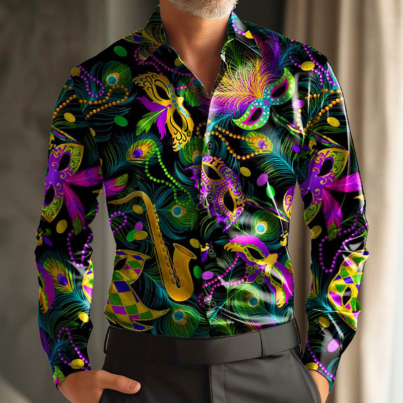 Mardi Gras Men's Paisley Carnival Mask with Feathers Shirt Satin Shirt Dress Shirt Long Sleeve Fashion Casual Party Holiday Summer Spring Turndown 3D Print Button Up Shirts Black White Yellow Rose Red
