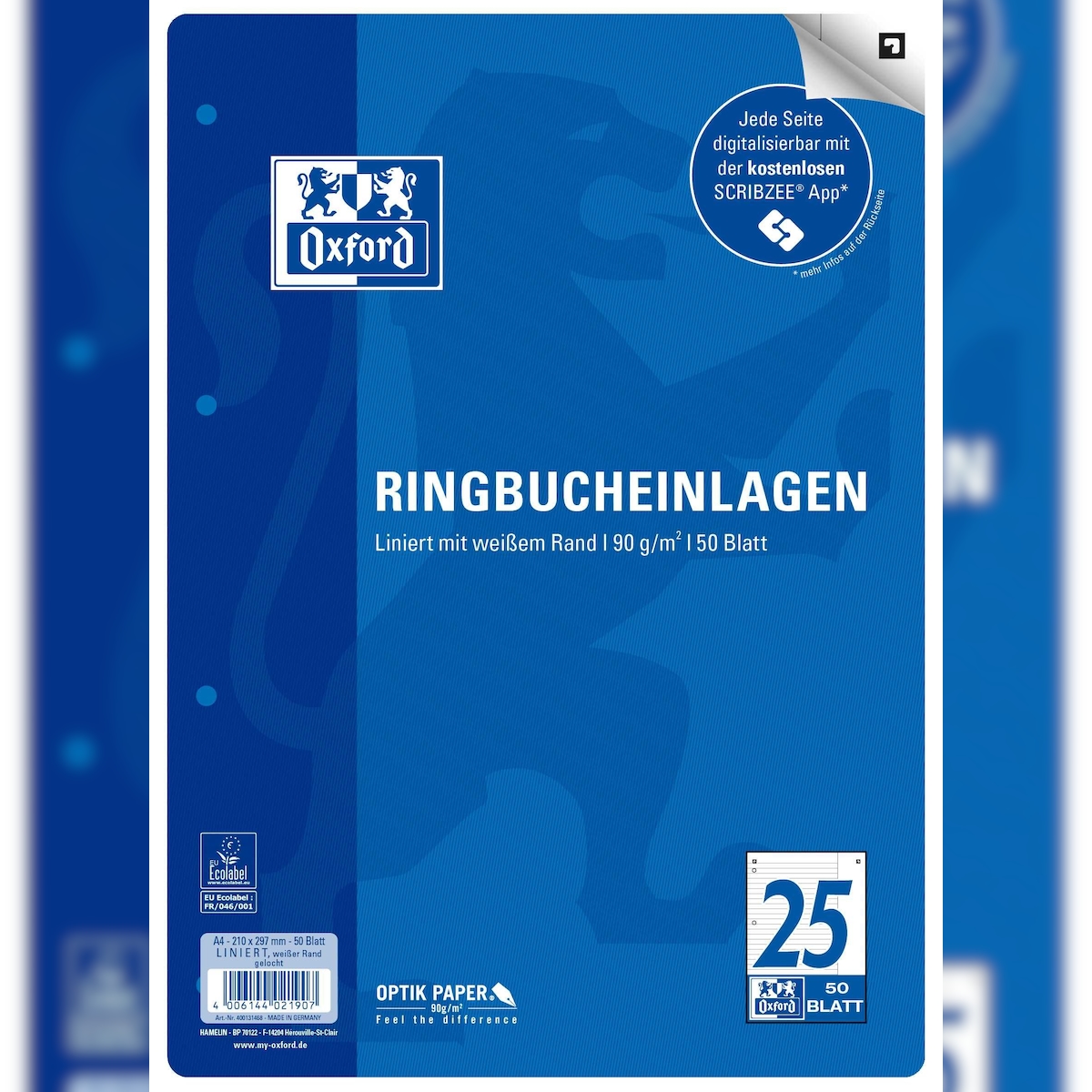Oxford 400131468 Ringbucheinlage LIN25 - A4, liniert, 90g/qm, 4-fach gelocht, 50 Blatt