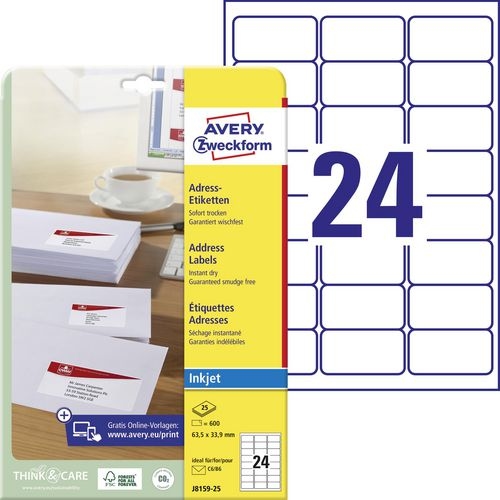 AVERY Zweckform Adressetiketten J8159-25 Selbsthaftend DIN A4 Weiß 63,5 x 33,9 mm 25 Blatt à 24 Etiketten