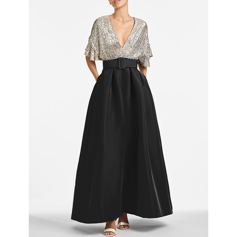 A-Line Ankle Length Evening Gown Ball Gown Formal Dress Elegant Sparkle Shine Half Sleeve V Neck Formal Wedding Guest Fall Wedding Guest Sequined with Sequin Strappy
