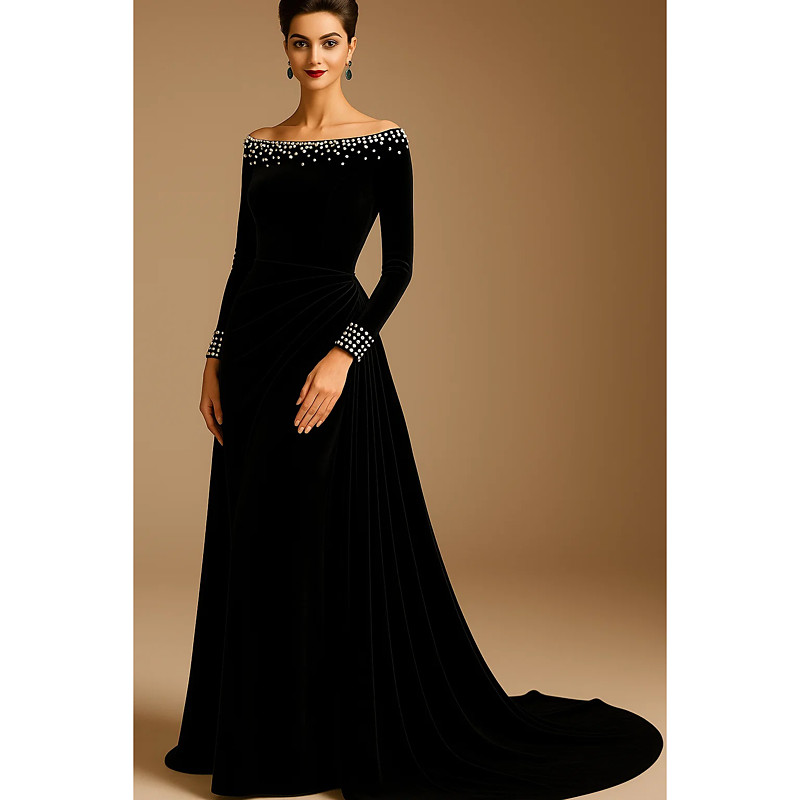 A-Line Sheath Column Sweep Brush Train Velvet Dress Vintage Dress Formal Dresses Evening Gown Ball Gown with Overskirt Elegant Glittering Celebrity Style Long Sleeve Off Shoulder Wedding Formal Velvet