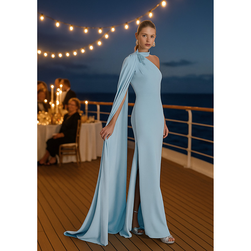 Sheath Column Floor Length Ball Gown with Cape Evening Gown Ball Gown Elegant High Split Sleeveless High Neck Wedding Formal Pocket Stretch Crepe with Pleats Appliques