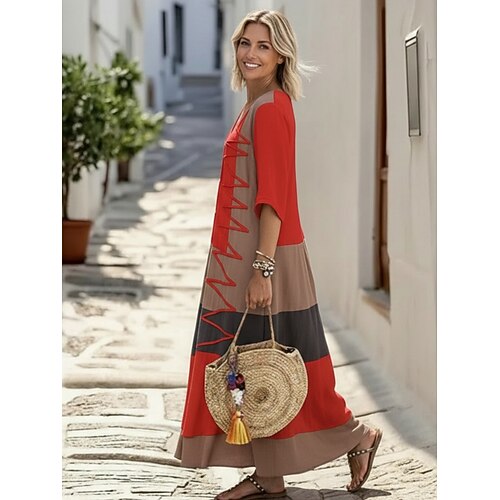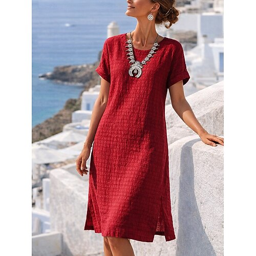 Per donna Abito maxi Finto cotone e lino Abito Camicia Abito Bianco Casual Quotidiano Weekend Vestibilità comoda Semplice Manica 3/4 Girocollo Blu Nero Bianco Rosso Estate Primavera
