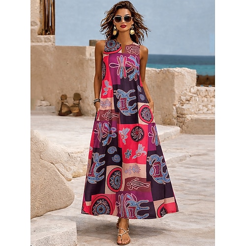 Per donna Abito maxi Vestito Estivo Abito a trapezio Abito Estivo Vacanza Casual Boho Quotidiano Ferie Vestibilità comoda Grafico Tribale Senza Maniche Scollo a V All'americana Rosa Estate Primavera